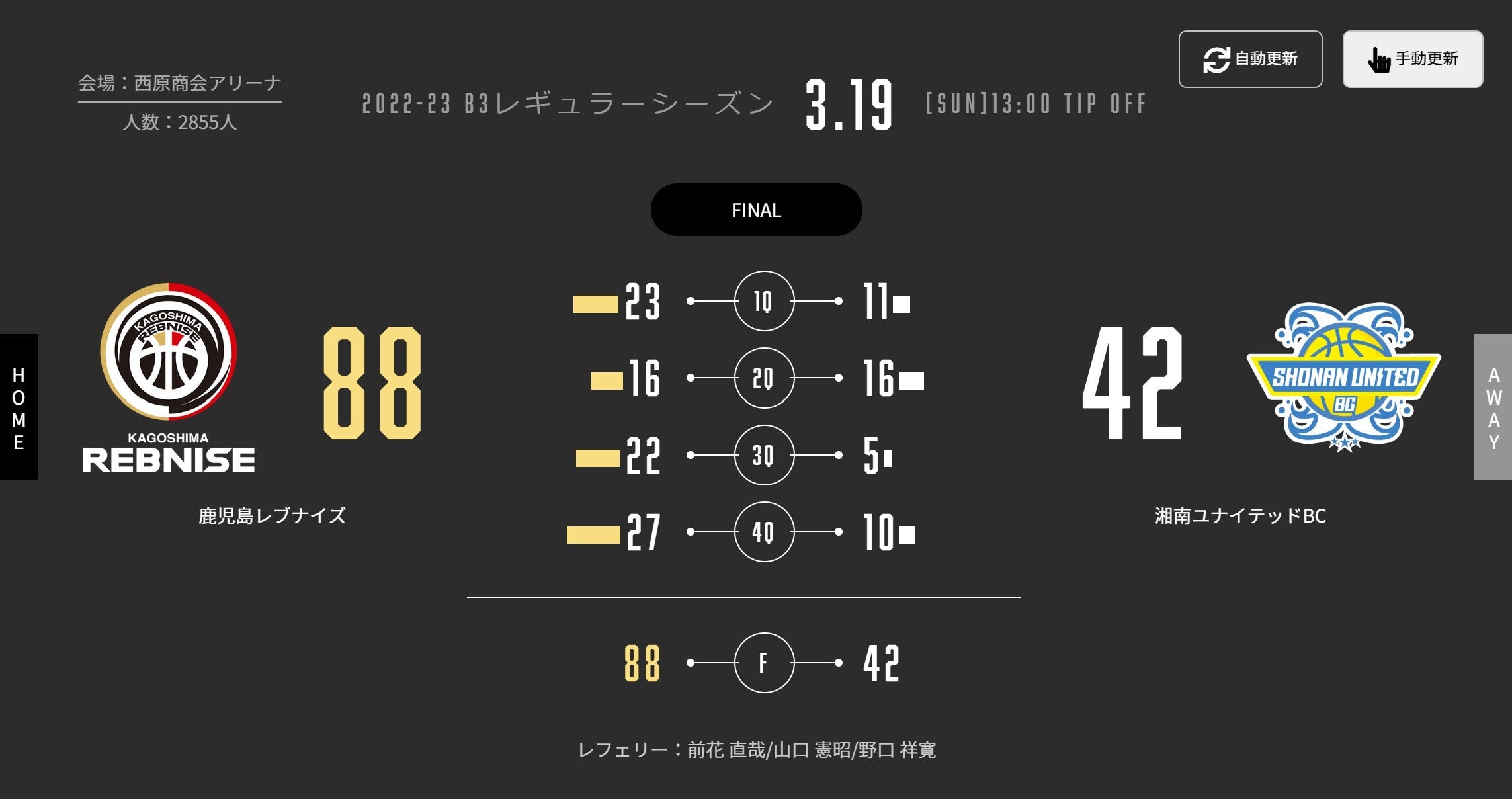 本日(3/19)、B3リーグ 2022-23シーズン 第23節 西原商会アリーナで湘南ユナイテッドBCと対戦しました。試合結果をお知らせします。