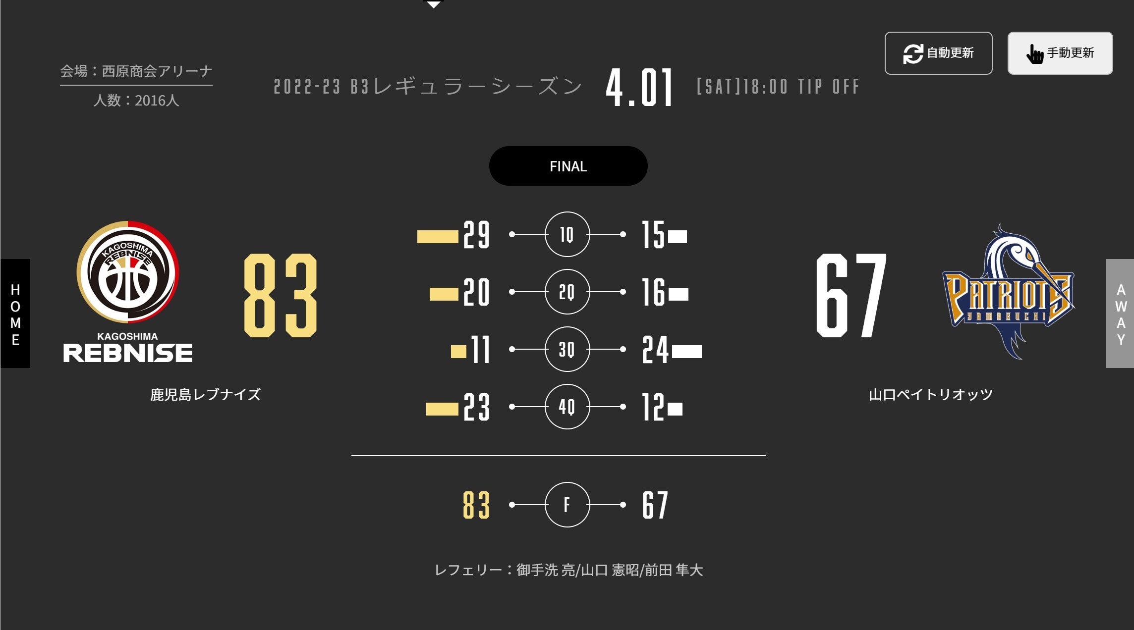 本日(4/1)、B3リーグ 2022-23シーズン 第25節 西原商会アリーナで山口ペイトリオッツと対戦しました。試合結果をお知らせします。