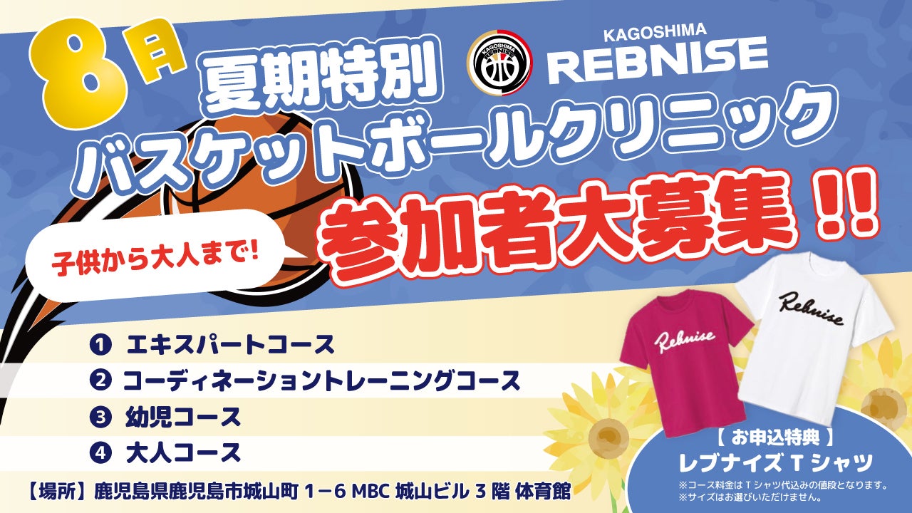 この度、鹿児島レブナイズでは、8月に「夏期特別バスケットボールクリニック」を開催することとなりましたのでお知らせいたします。