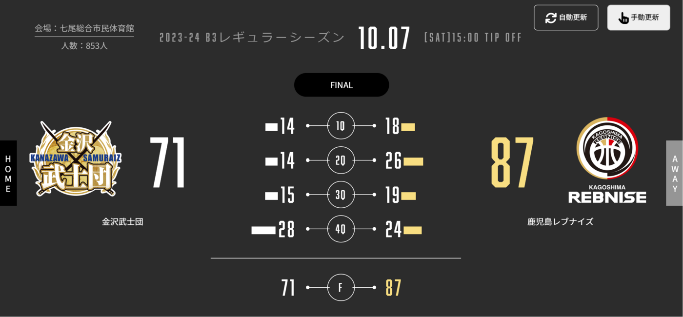 本日(10/7)、B3リーグ 2023-24シーズン 開幕節 AWAY七尾で総合市民体育館で金沢武士団と対戦しました。試合結果をお知らせします。