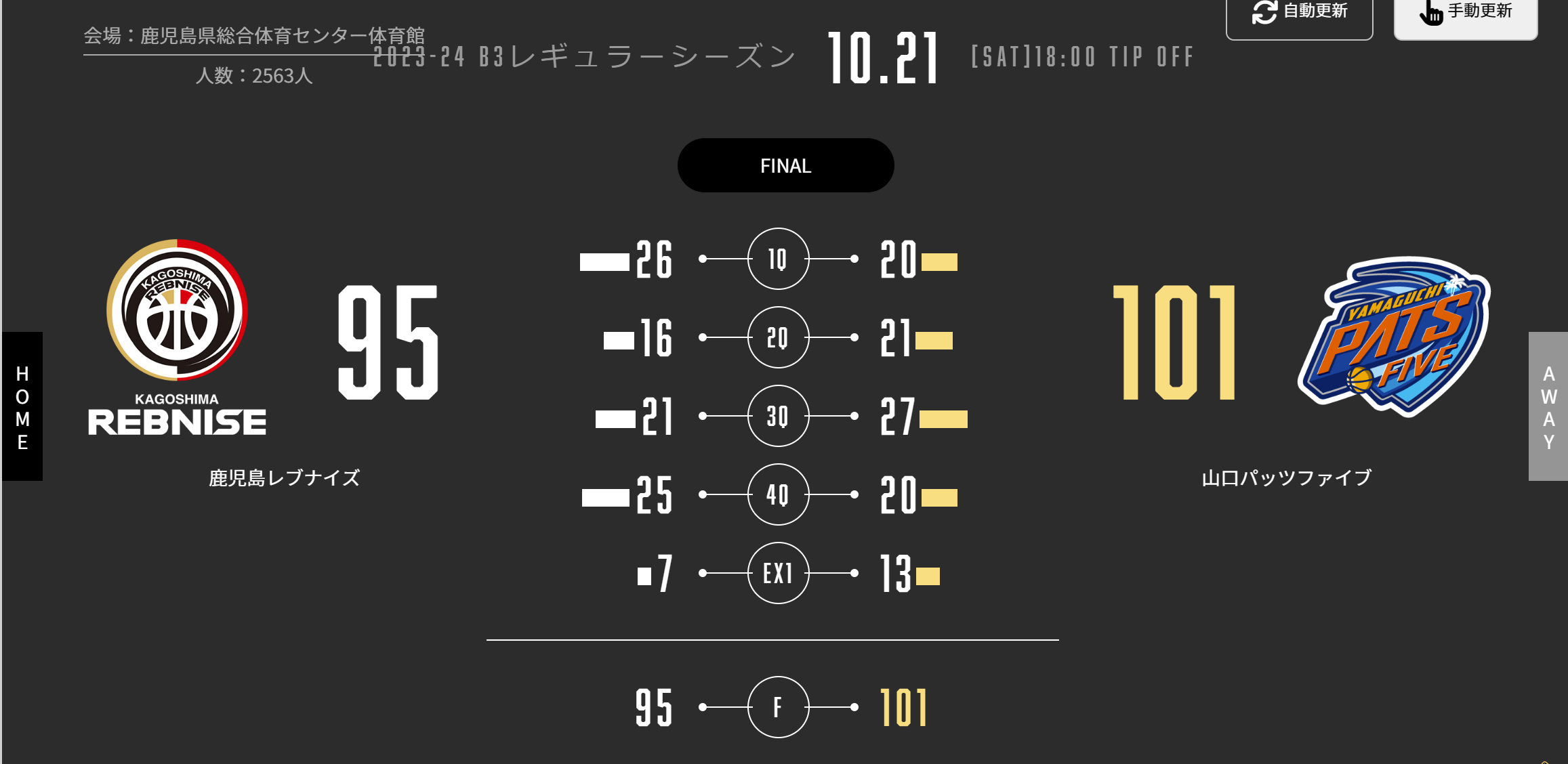 本日(10/21)、B3リーグ 2023-24シーズン 第3節 鹿児島県総合体育センター体育館で山口パッツファイブと対戦しました。試合結果をお知らせいたします。