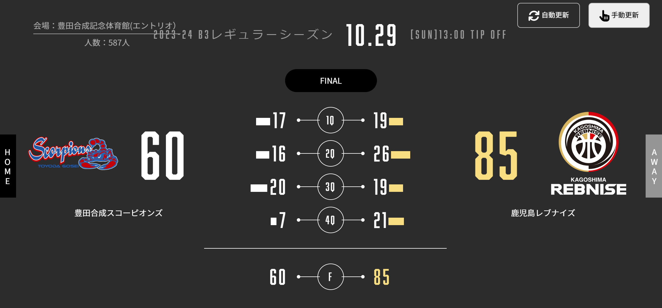本日(10/29)、B3リーグ 2023-24シーズン 第4節 AWAY豊田合成記念体育館(エントリオ)で豊田合成スコーピオンズと対戦しました。試合結果をお知らせします。