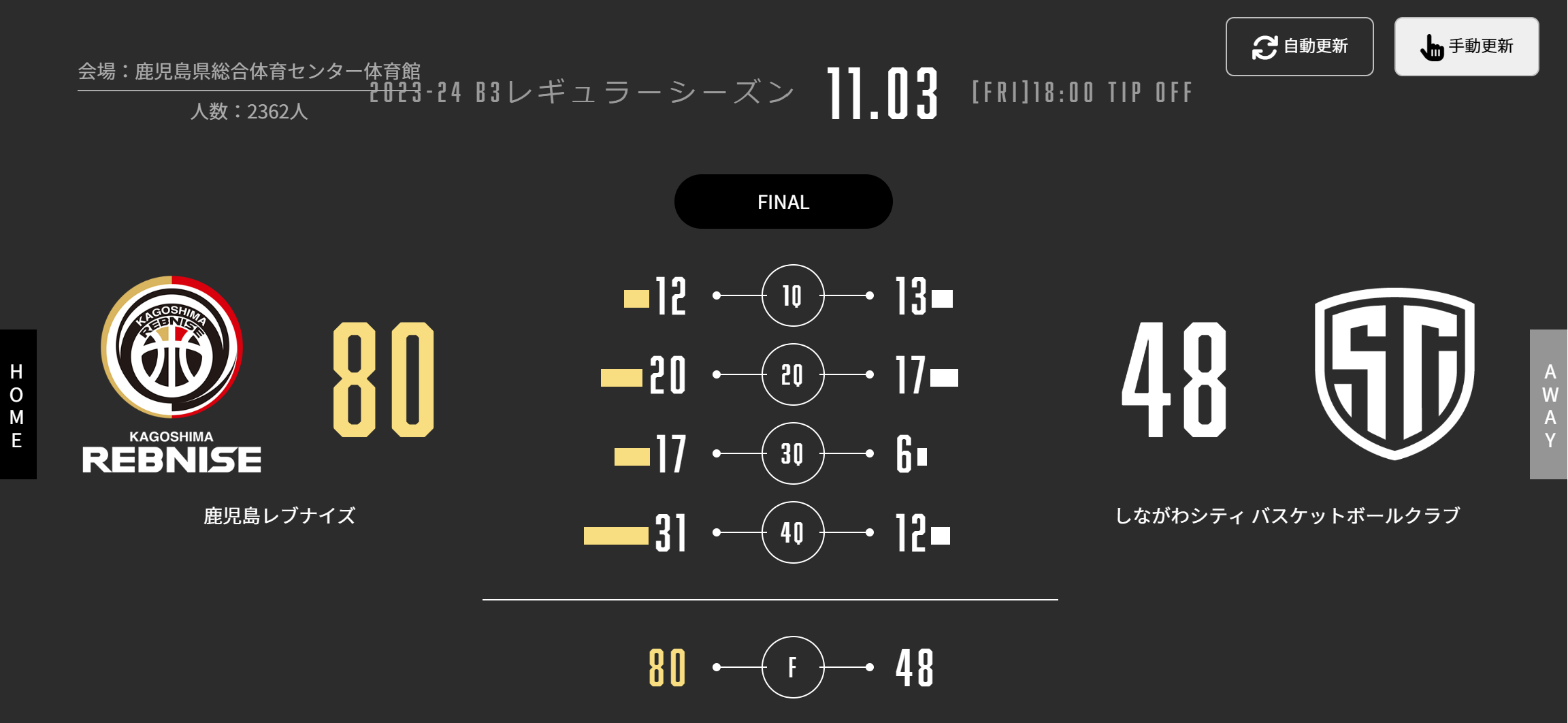 本日(11/3)、B3リーグ 2023-24シーズン 第5節 鹿児島県総合体育センター体育館でしながわシティバスケットボールクラブと対戦しました。試合結果をお知らせします。