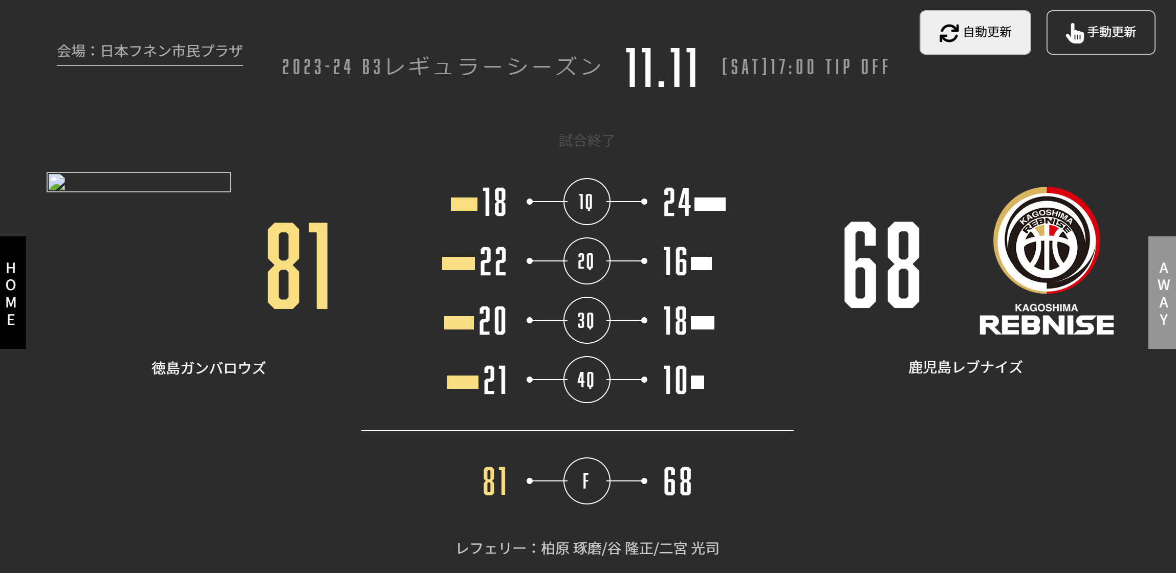 本日(11/11)、B3リーグ 2023-24シーズン 第6節 AWAY日本フネン市民プラザで徳島ガンバロウズと対戦しました。試合結果をお知らせします。