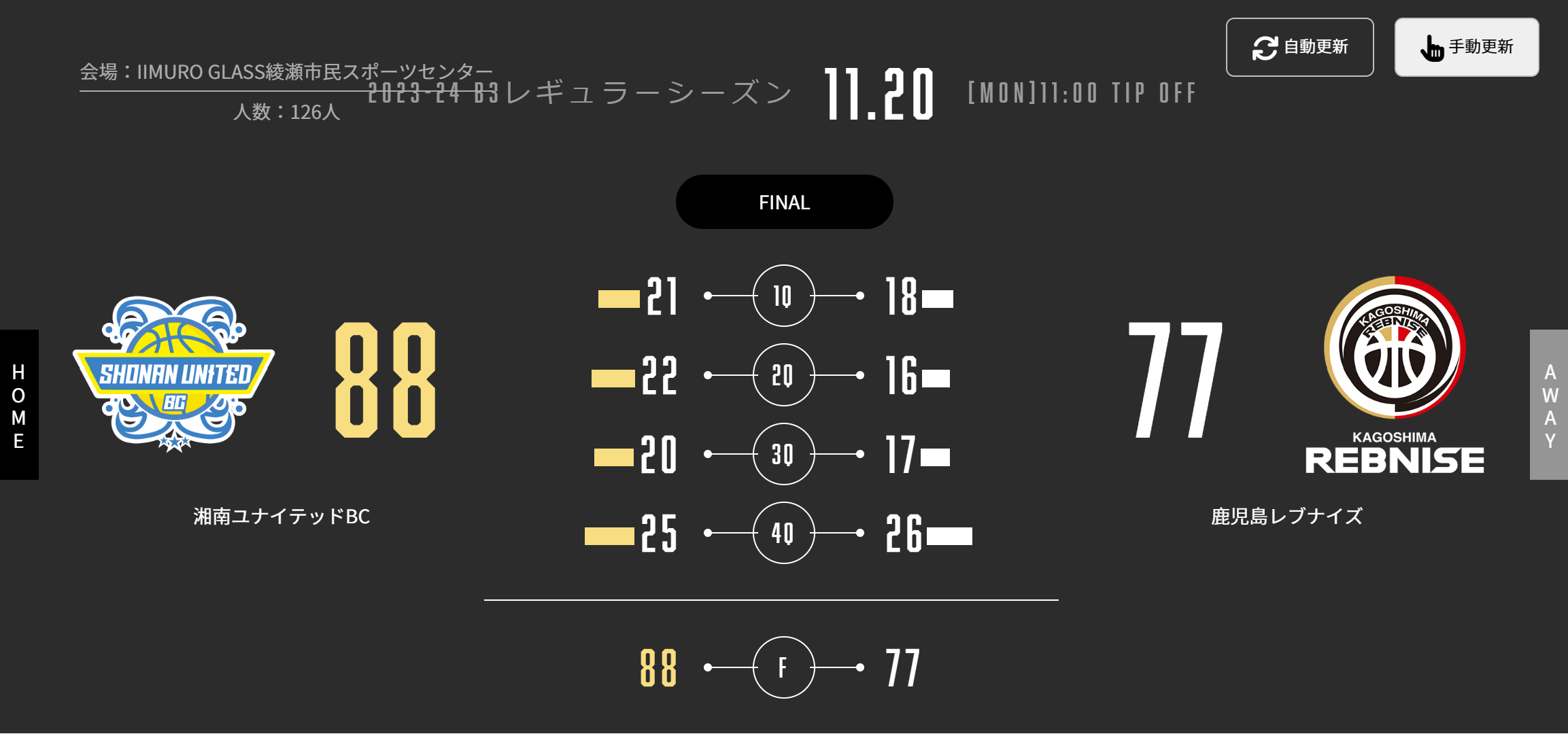 本日(11/20)、B3リーグ 2023-24シーズン 第7節 AWAYIIMURO GLASS綾瀬市民スポーツセンターで湘南ユナイテッドBCと対戦しました。試合結果をお知らせします。