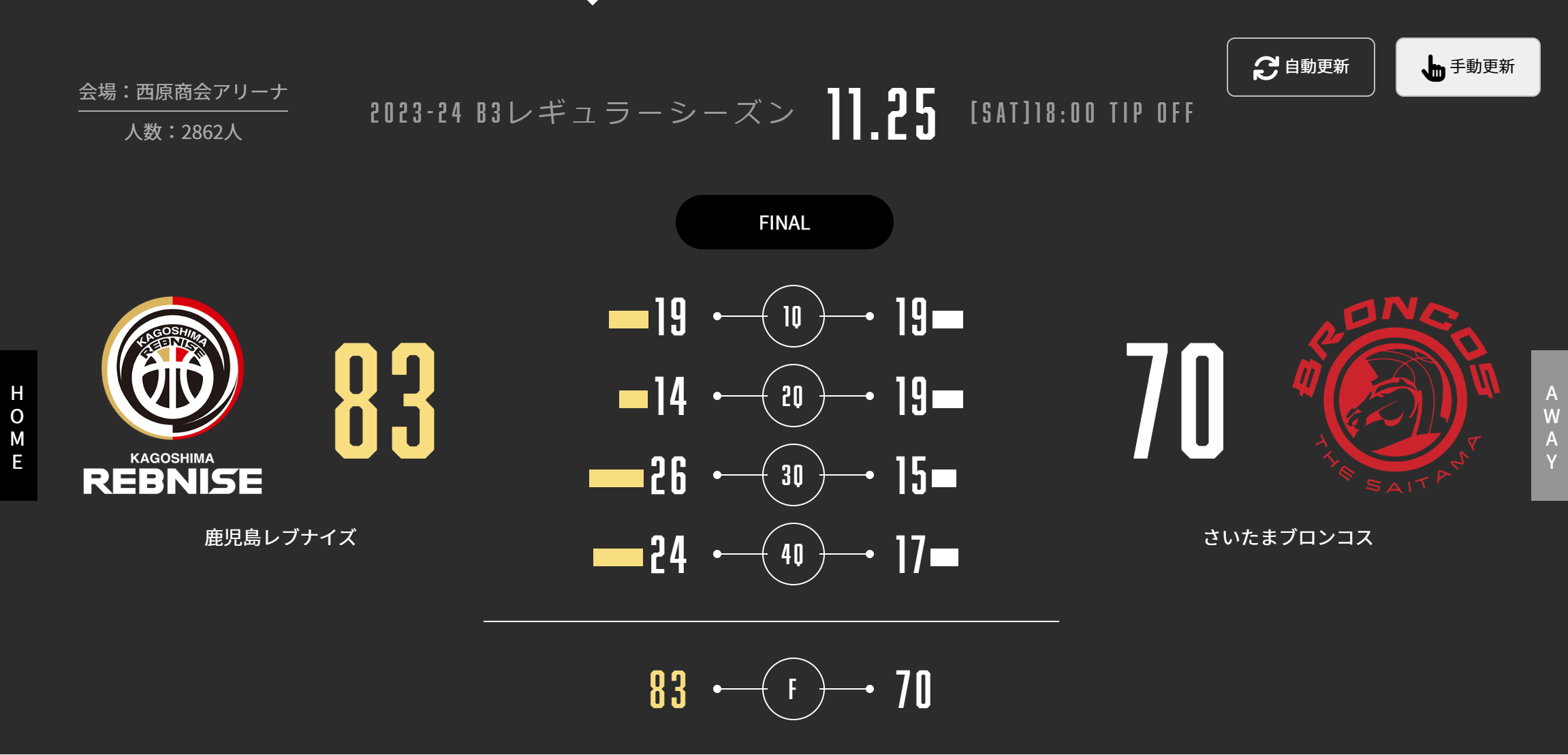 本日(11/25)、B3リーグ 2023-24シーズン 第8節 西原商会アリーナでさいたまブロンコスと対戦しました。試合結果をお知らせします。