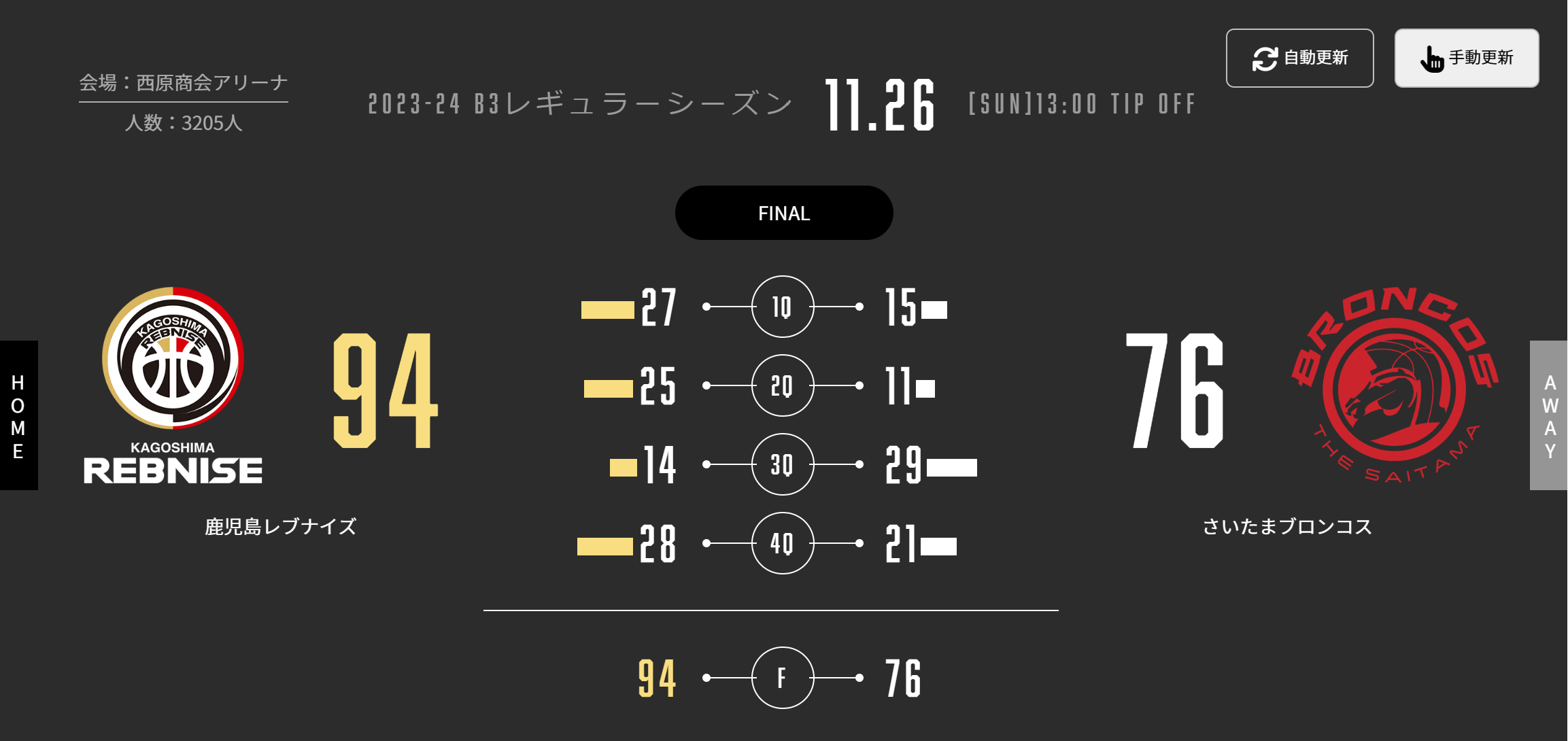 本日(11/26)、B3リーグ 2023-24シーズン 第8節 西原商会アリーナでさいたまブロンコスと対戦しました。試合結果をお知らせします。