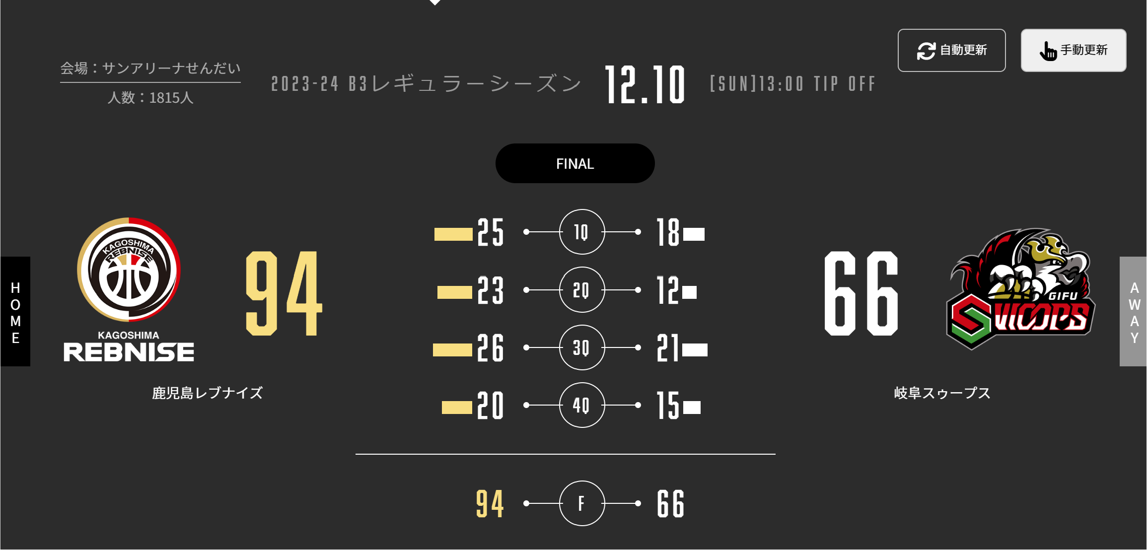 本日(12/10)、B3リーグ 2023-24シーズン 第10節 サンアリーナせんだいで岐阜スゥープスと対戦しました。試合結果をお知らせします。