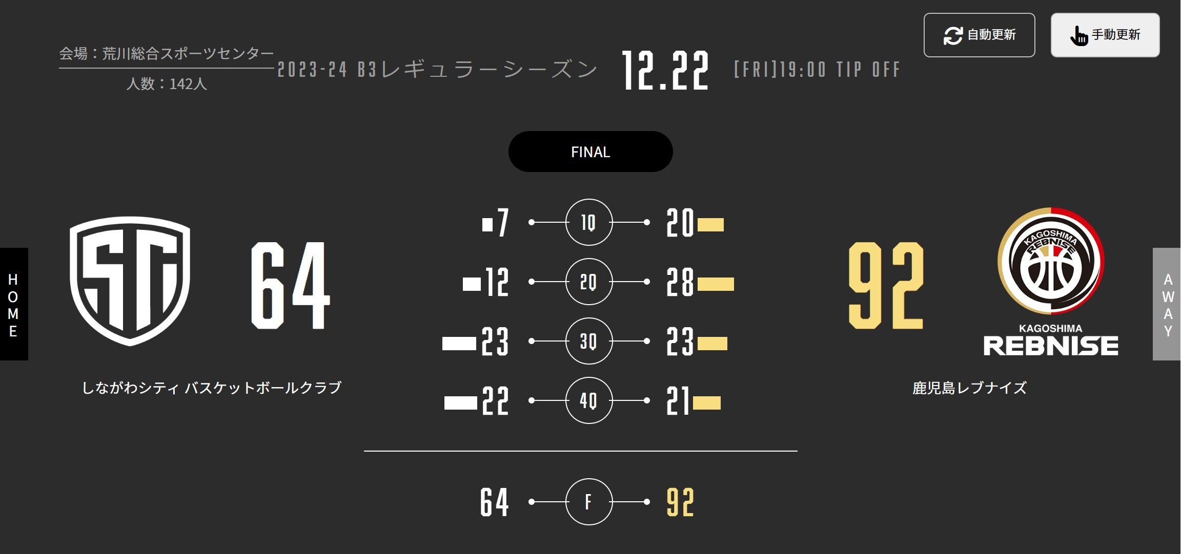 本日(12/22)、B3リーグ 2023-24シーズン 第12節 AWAY荒川総合スポーツセンターでしながわシティバスケットボールクラブと対戦しました。試合結果をお知らせします。