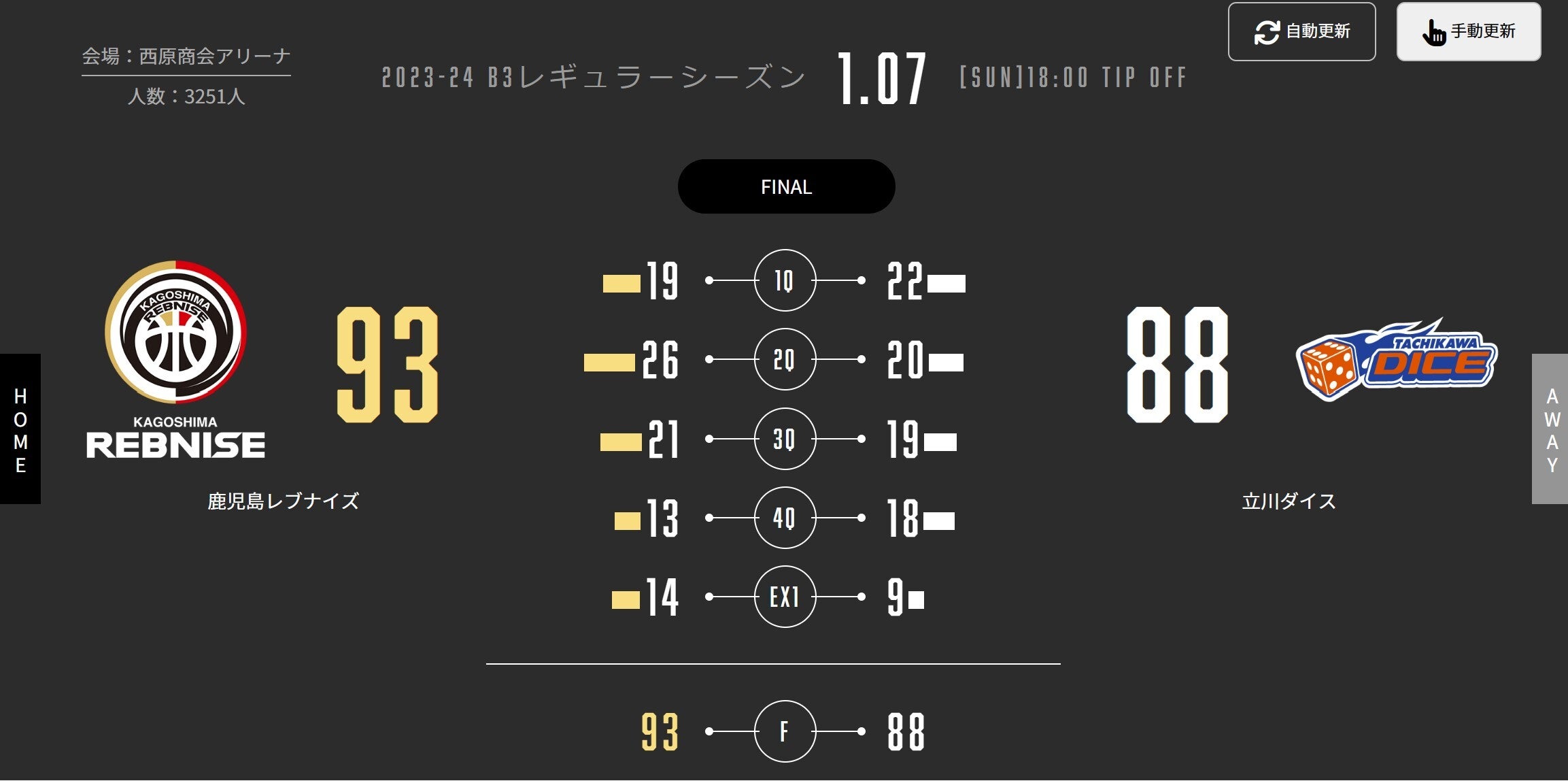 本日(1/7)、B3リーグ 2023-24シーズン 第13節 西原商会アリーナで立川ダイスと対戦しました。試合結果をお知らせします。