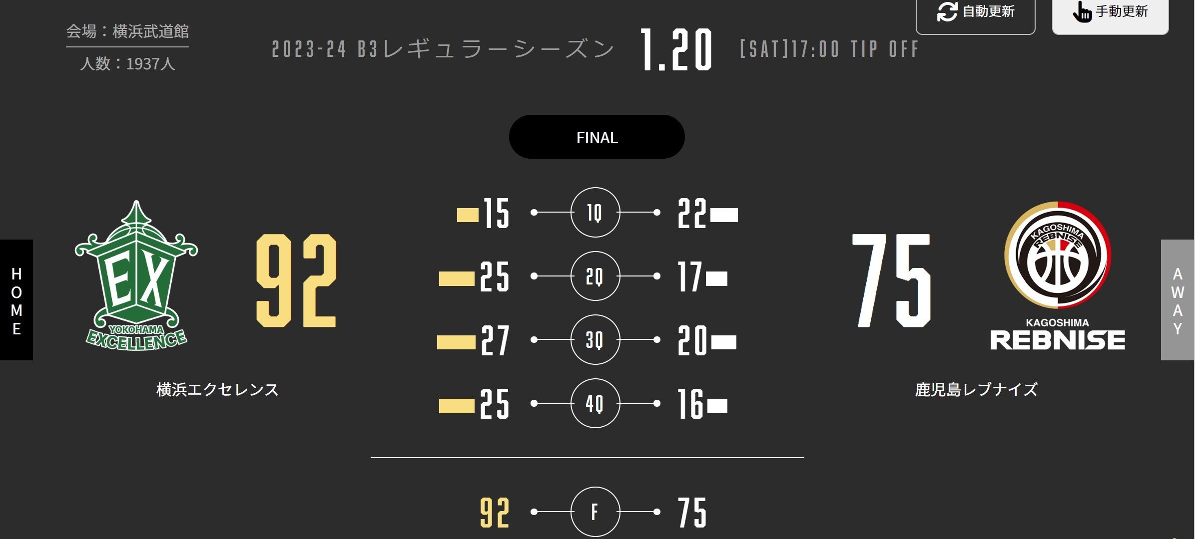 B3リーグ 2023-24シーズン 第15節 GAME1(1/20) 試合結果のお知らせ
