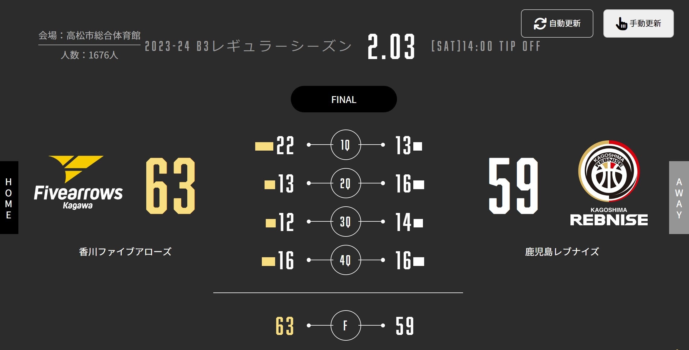 本日(2/3)、B3リーグ 2023-24シーズン 第17節 AWAY 高松市総合体育館で香川ファイブアローズと対戦しました。試合結果をお知らせします。