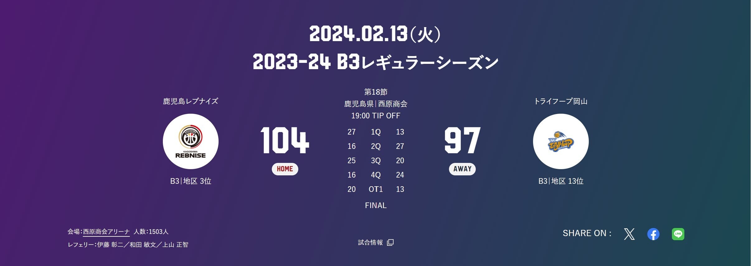 WIN!WIN!WIN!B3リーグ 2023-24シーズン 第18節 GAME2(2/13) 試合結果のお知らせ