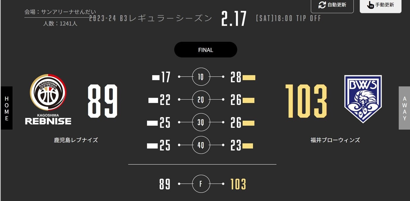 本日(2/17)、B3リーグ 2023-24シーズン 第19節 サンアリーナせんだいで福井ブローウィンズと対戦しました。試合結果をお知らせします。