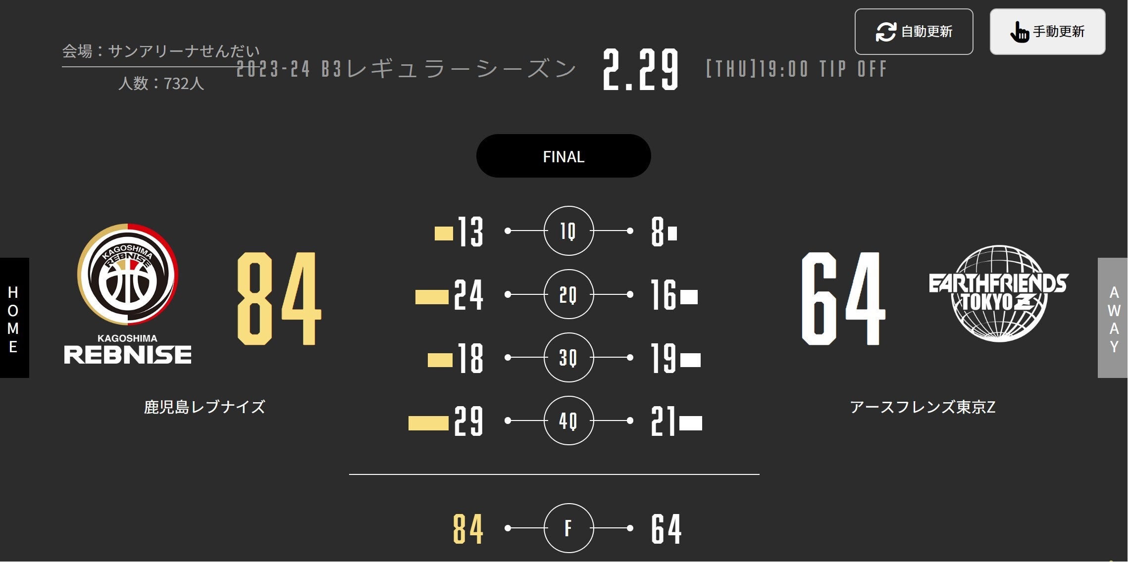 本日(2/29)、B3リーグ 2023-24シーズン 第21節 サンアリーナせんだいでアースフレンズ東京Zと対戦しました。試合結果をお知らせします。