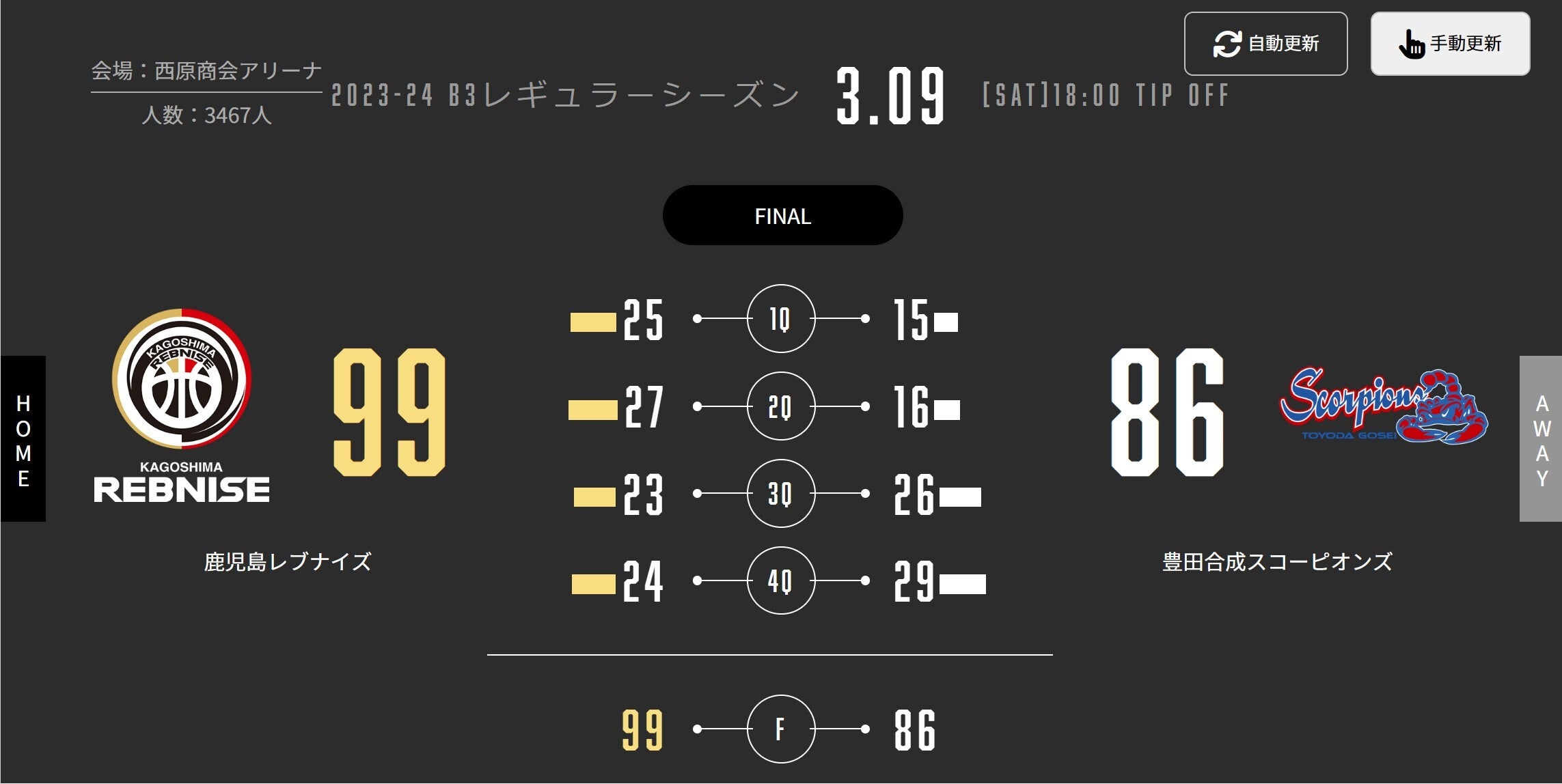 本日(3/9)、B3リーグ 2023-24シーズン 第22節 西原商会アリーナで豊田合成スコーピオンズと対戦しました。試合結果をお知らせします。