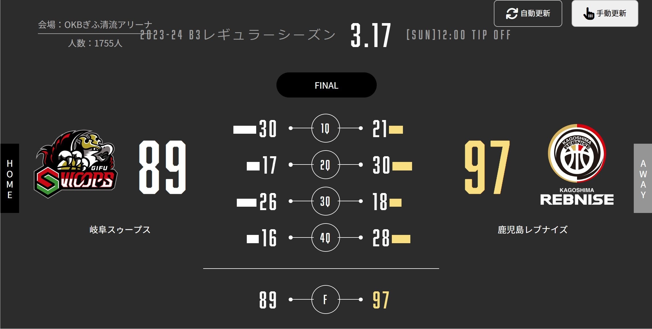 本日(3/17)、B3リーグ 2023-24シーズン 第23節 AWAY OKBぎふ清流アリーナで岐阜スゥープスと対戦しました。試合結果をお知らせします。