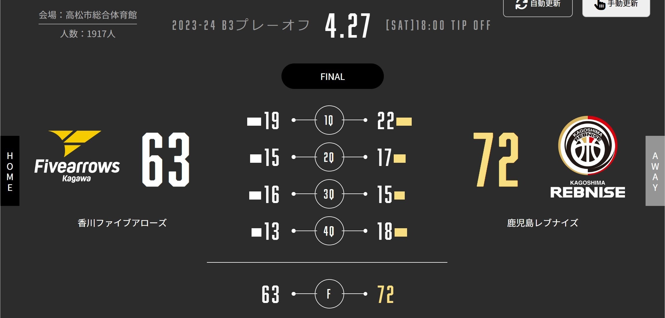 本日(4/27)、AWAY高松市総合体育館で「B3 PLAYOFFS SEMIFINALS 2023-24」GAME1 香川ファイブアローズと対戦しました。試合結果をお知らせします。