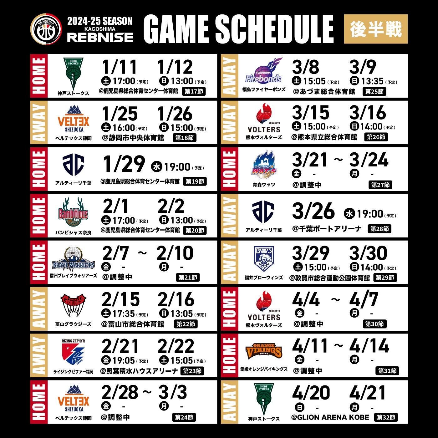この度、鹿児島レブナイズでは、りそなグループB.LEAGUE 2024-25シーズン リーグ戦の試合情報が決定しましたのでご報告いたします。