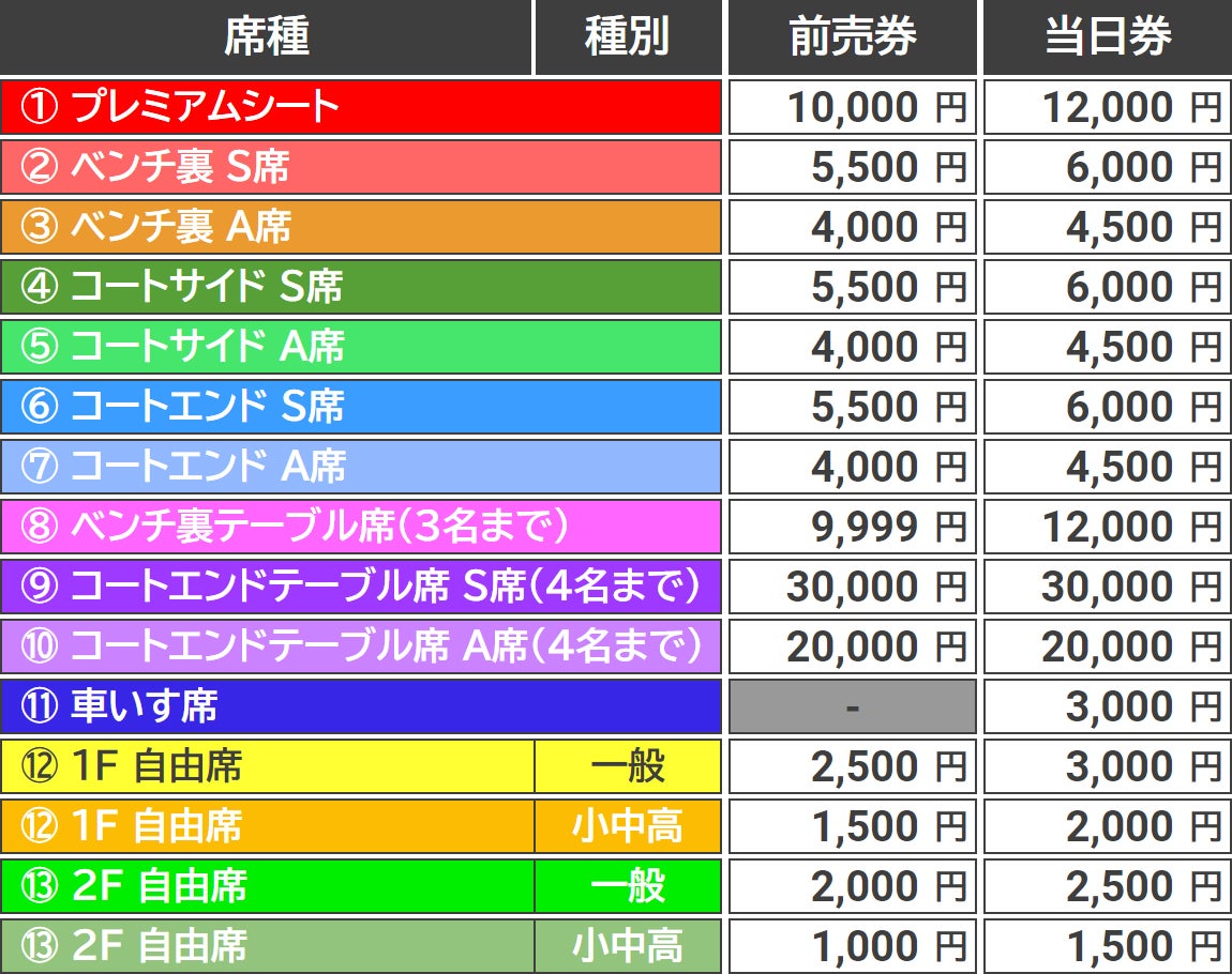 ベンチ裏のテーブル席につきまして、チケットの新システムの設定の都合上、価格は10,000円から9,999円になります。