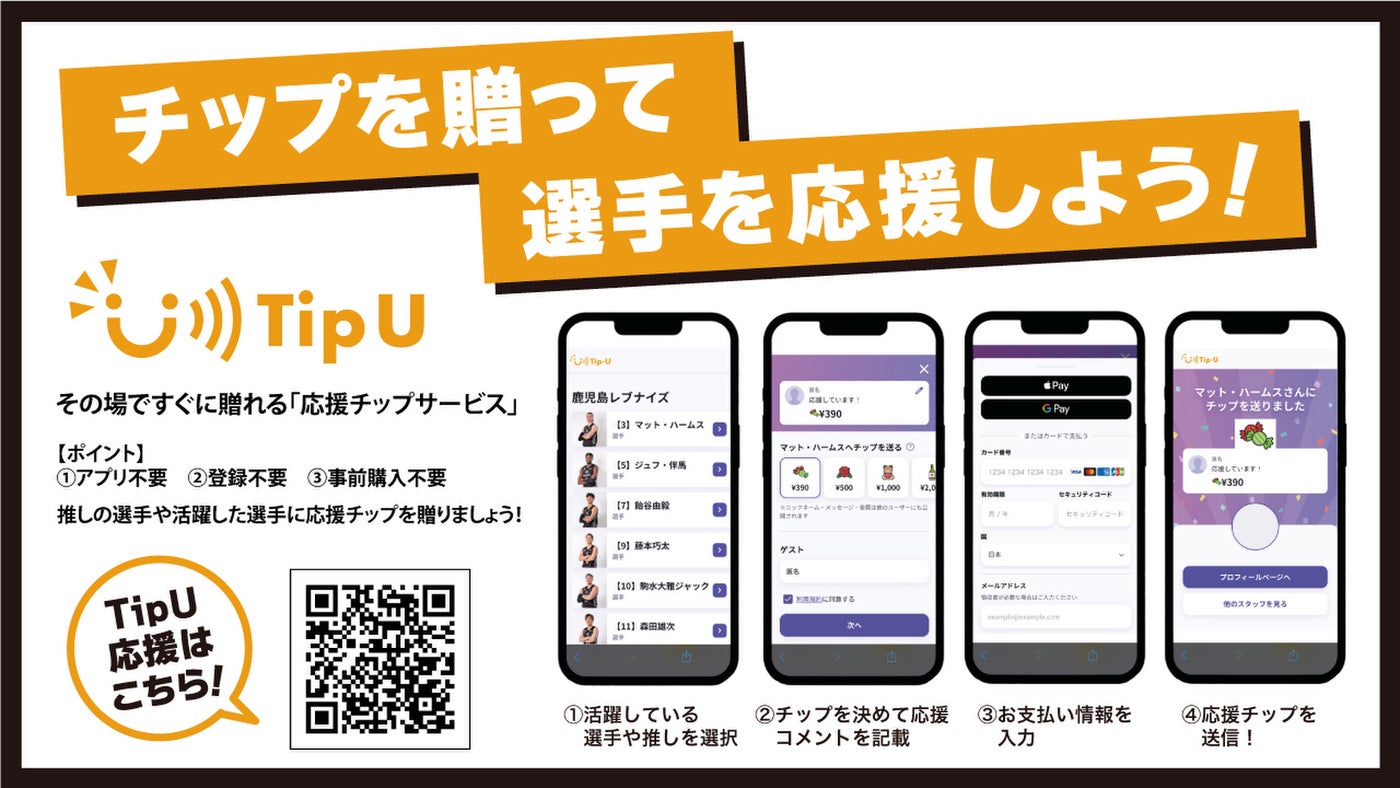 この度、鹿児島レブナイズでは、その場ですぐに贈れる応援チップサービス「Tip U」を導入することとなりましたのでお知らせいたします。