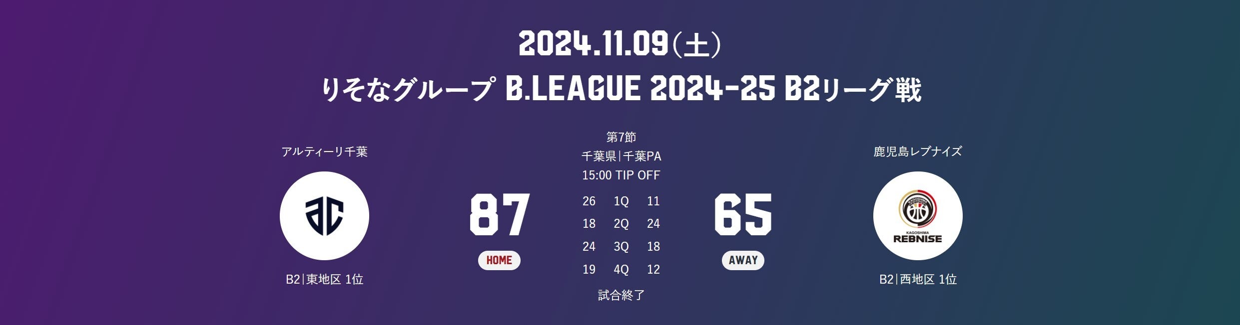 本日(11/9)、りそなグループ B.LEAGUE 2024-25シーズン 第7節 GAME1 アルティーリ千葉と対戦しました。試合結果をお知らせします。
