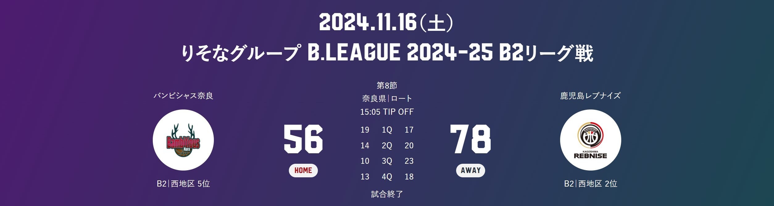 本日(11/16)、りそなグループ B.LEAGUE 2024-25シーズン 第8節 GAME1 バンビシャス奈良と対戦しました。試合結果をお知らせします。