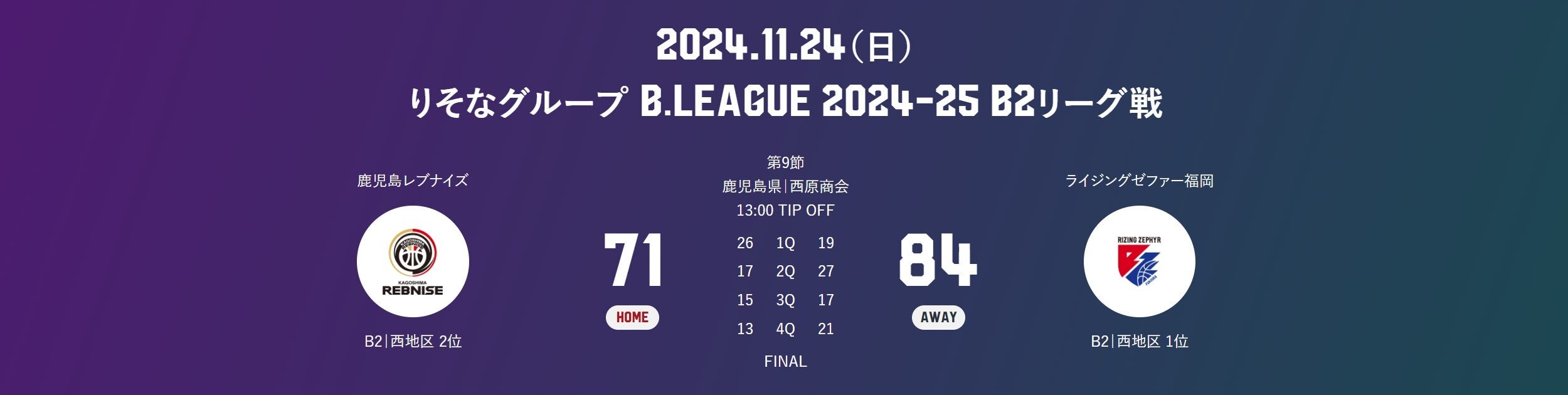 本日(11/24)、りそなグループ B.LEAGUE 2024-25シーズン 第9節 GAME2 ライジングゼファー福岡と対戦しました。試合結果をお知らせします。