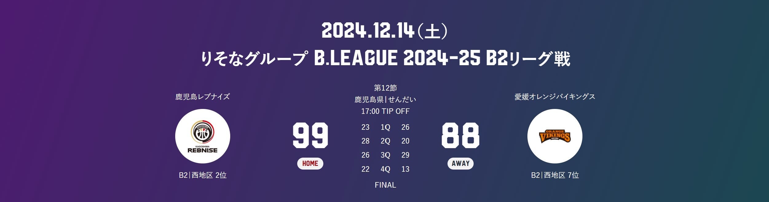 本日(12/14)、りそなグループ B.LEAGUE 2024-25シーズン 第12節 GAME1 愛媛オレンジバイキングスと対戦しました。試合結果をお知らせします。