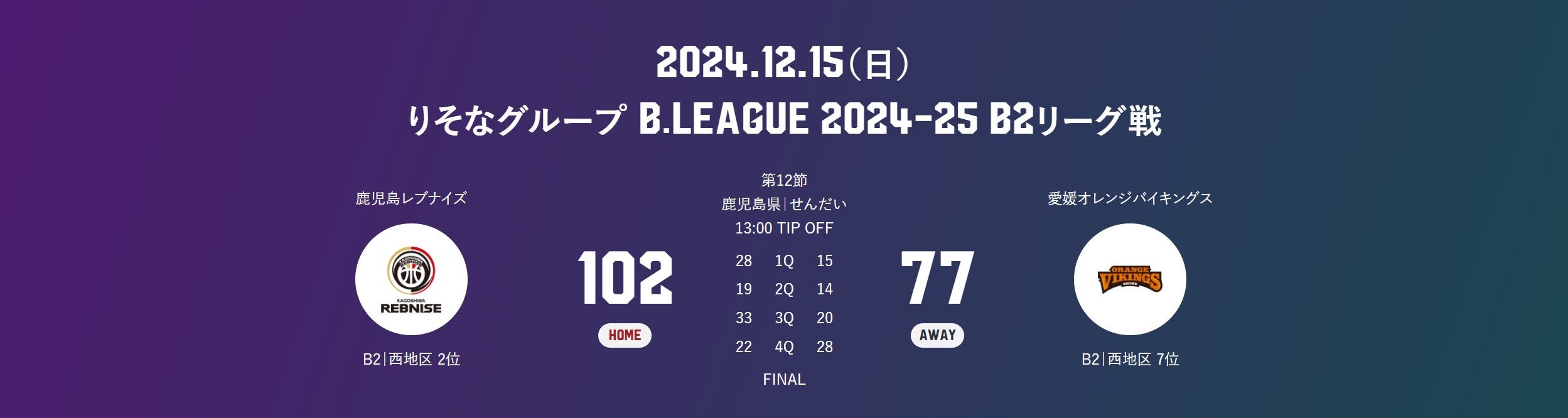 本日(12/15)、りそなグループ B.LEAGUE 2024-25シーズン 第12節 GAME2 愛媛オレンジバイキングスと対戦しました。試合結果をお知らせします。