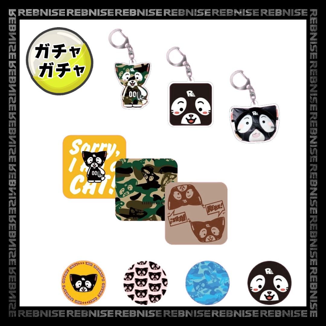 れぶにゃんのミニタオル、缶バッジ、アクリルキーホルダー。れぶにゃん尽くしのガチャガチャ