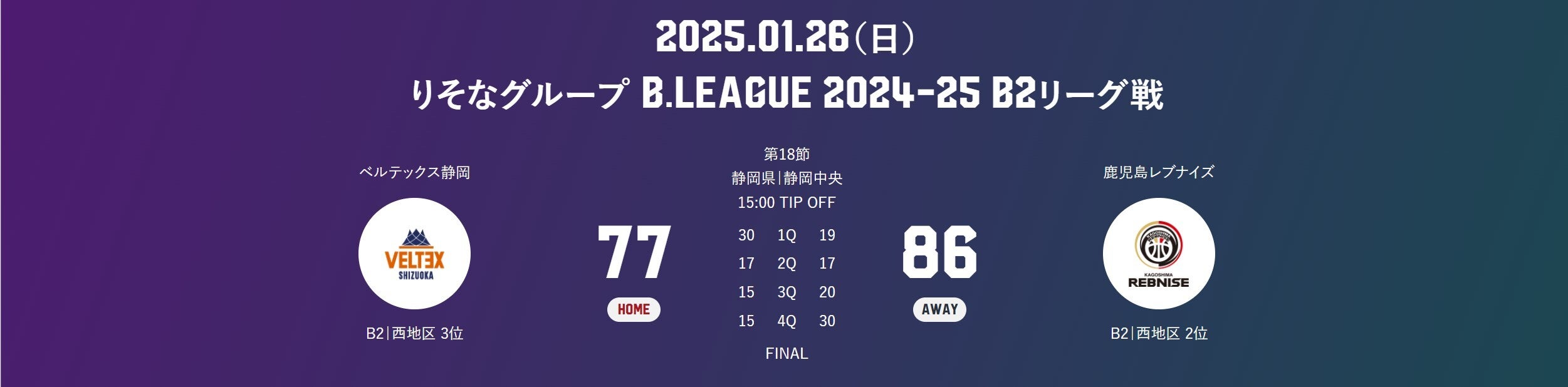 本日(1/26)、りそなグループ B.LEAGUE 2024-25シーズン 第18節 ベルテックス静岡と対戦しました。試合結果をお知らせします。