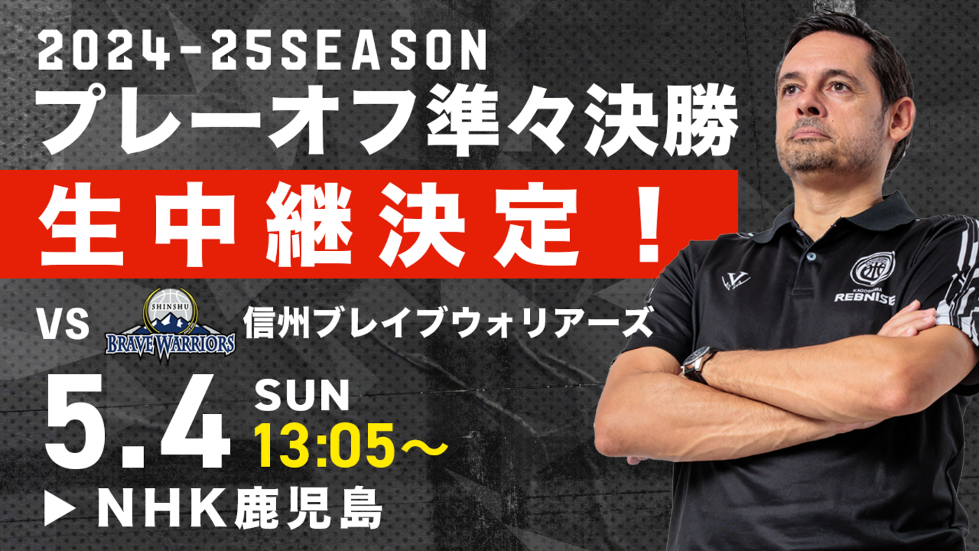 この度、鹿児島レブナイズでは、りそなグループ B2 PLAYOFFS QUARTERFINALS 2024-25 GAME2の信州ブレイブウォリアーズ戦を、NHK鹿児島放送局様に地上波生中継いただくことが決定しましたのでお知らせいたします。