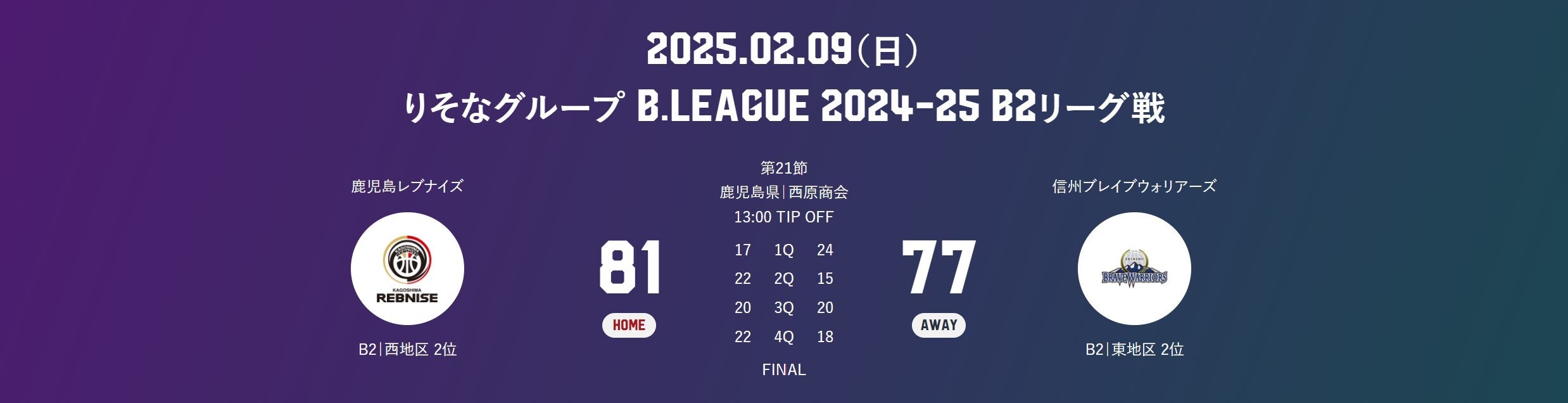 WIN!WIN!WIN!りそなグループ B.LEAGUE 2024-25シーズン 第21節(2/9)試合結果のお知らせ
