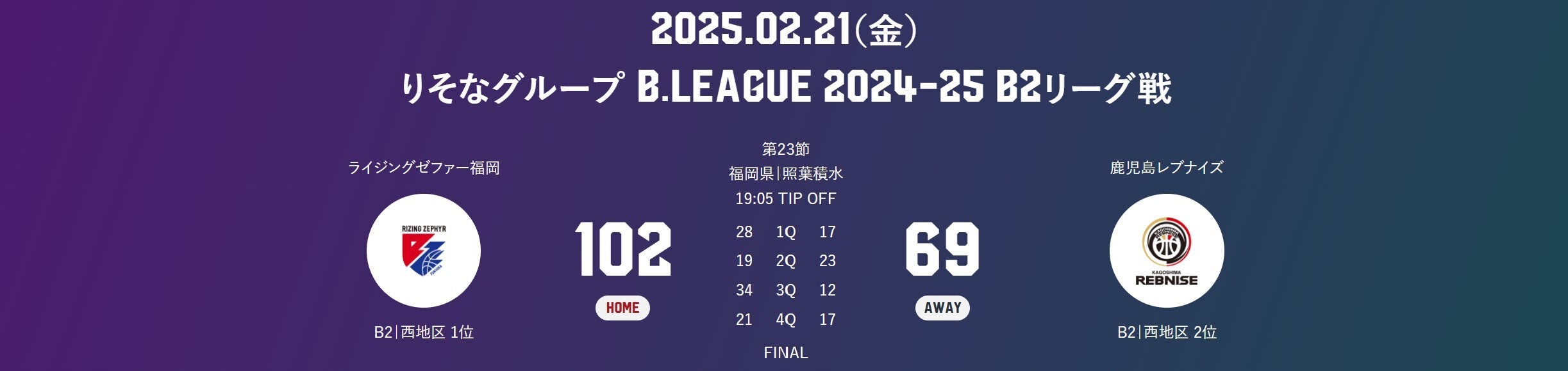 本日(2/21)、りそなグループ B.LEAGUE 2024-25シーズン 第23節 AWAYでライジングゼファー福岡と対戦しました。試合結果をお知らせします。