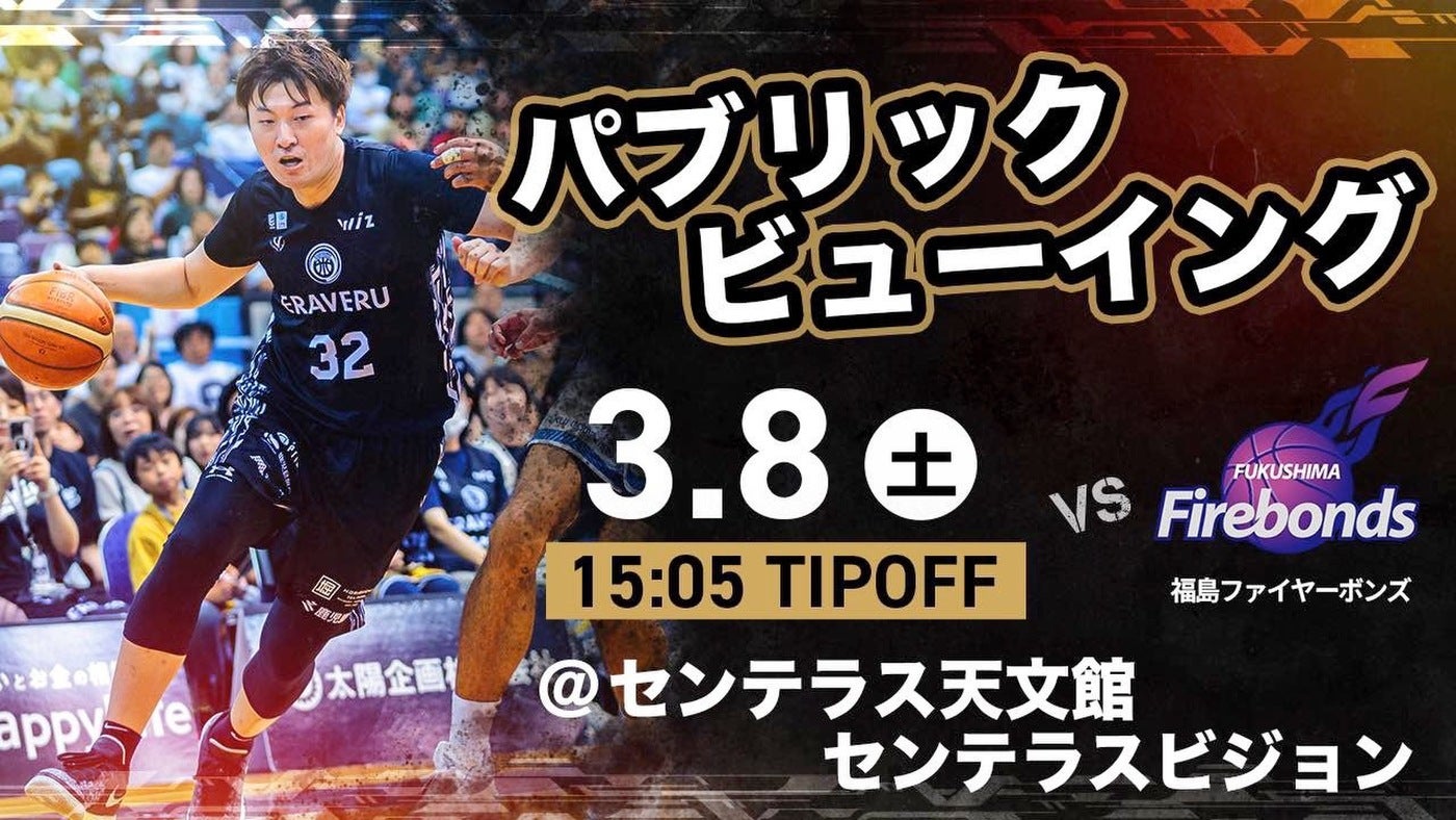 この度、鹿児島レブナイズでは、3月8日(土)AWAY 福島ファイヤーボンズ戦のパブリックビューイングをセンテラス天文館の約340インチの大型ビジョンにて開催することが決定しましたのでお知らせいたします。