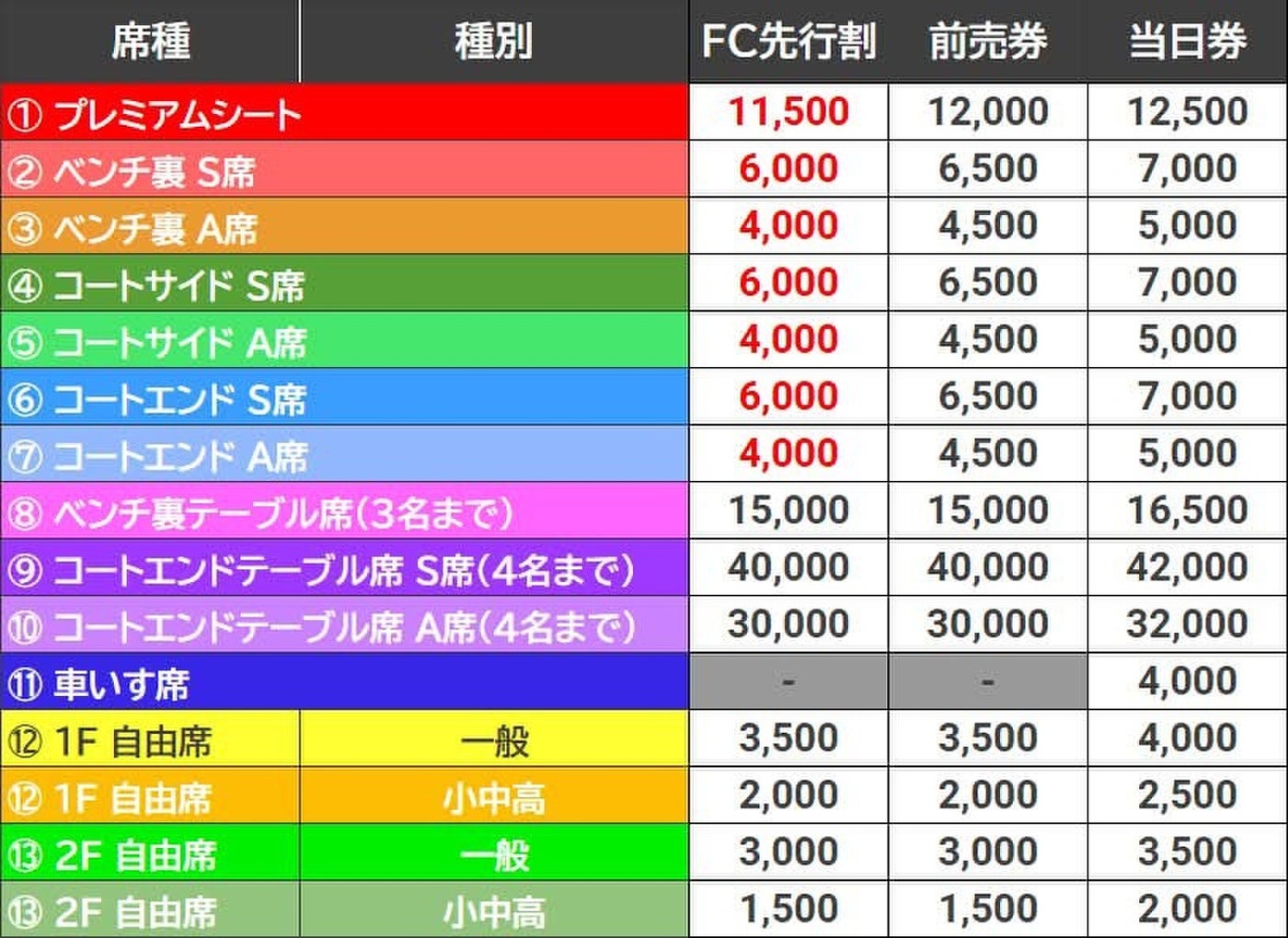 ホームゲーム当日、チケットブースにて前売り券の差額をお支払いいただくことでアップグレードが可能です。