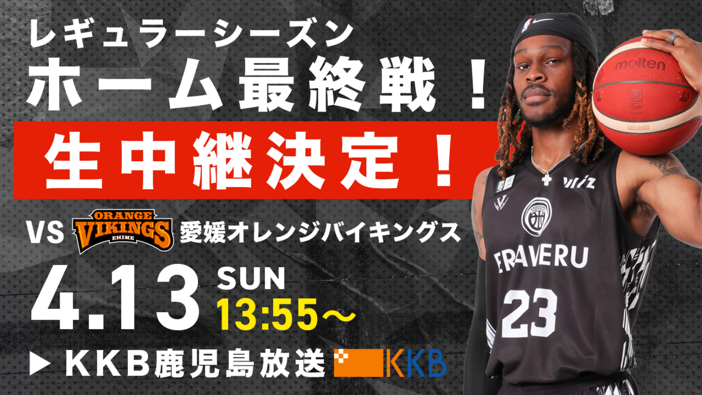 この度、鹿児島レブナイズでは、りそなグループ B.LEAGUE 2024-25シーズン ホーム最終戦(第31節)愛媛オレンジバイキングス戦を、KKB鹿児島放送様に地上波生中継いただくことが決定しましたのでお知らせいたします。