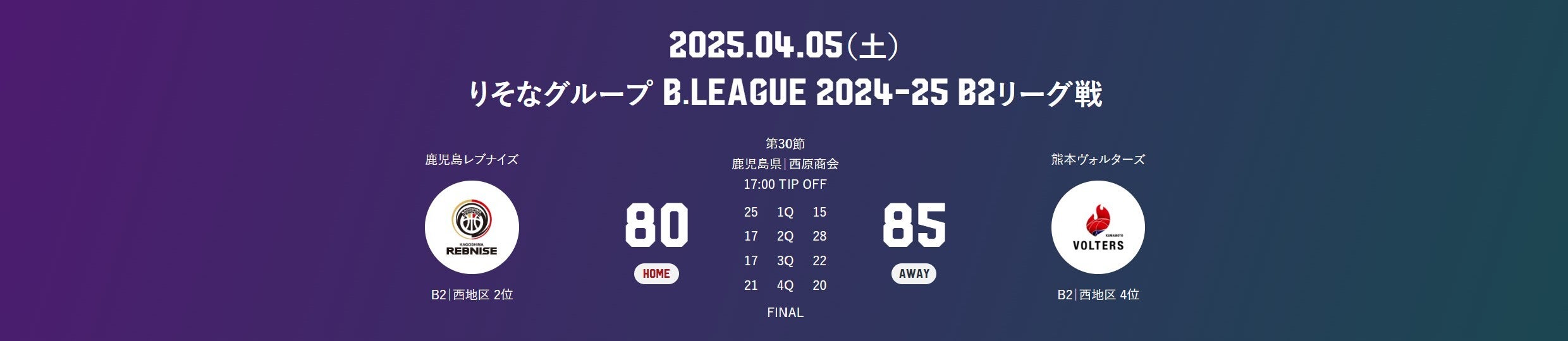 本日(4/5)、りそなグループ B.LEAGUE 2024-25シーズン 第30節 西原商会アリーナで熊本ヴォルターズと対戦しました。試合結果をお知らせします。