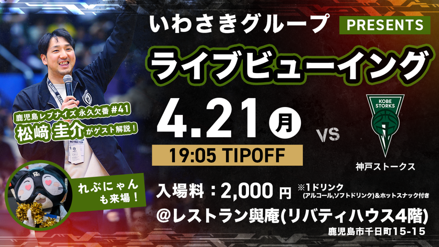 この度、鹿児島レブナイズでは、4月21日(月)にアウェーで行われる神戸ストークス戦のライブビューイングを天文館の『リバティハウス』にて開催することとなりましたのでお知らせいたします。