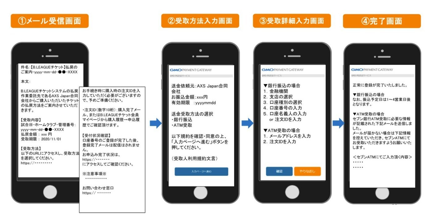 アカウントの解約等の事由により、キャンセルできない場合がございます。その場合、B.LEAGUEチケットサポートから、ご購入時のメールアドレス宛に後日GMOペイメントゲートウェイ株式会社のサービス「GMOPG送金サービス」での払戻をご案内いたしますので、ご了承ください。(差出人メールアドレスは「noreply @gmo-pg.com」となります)