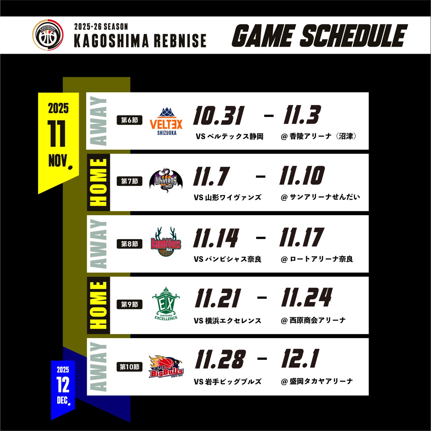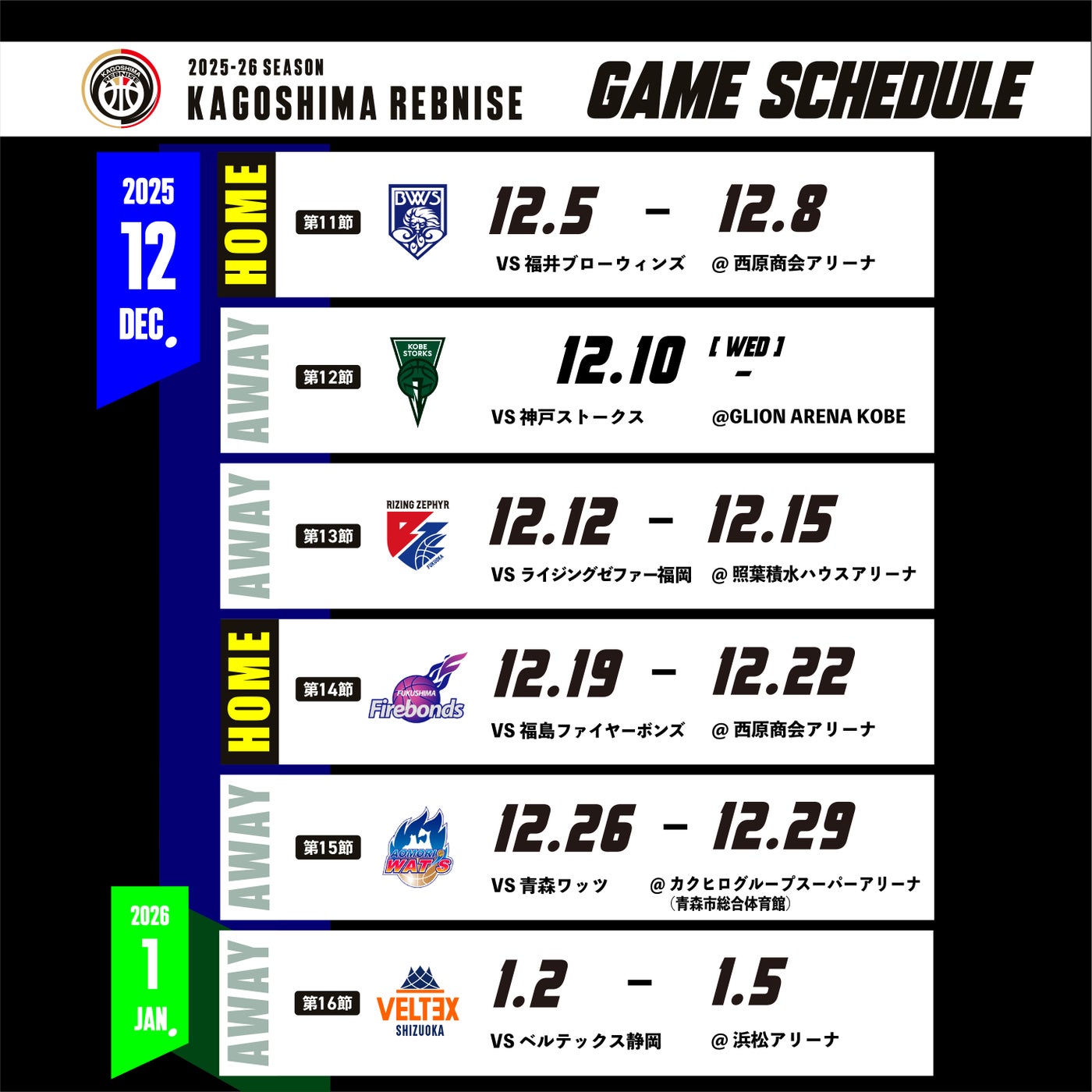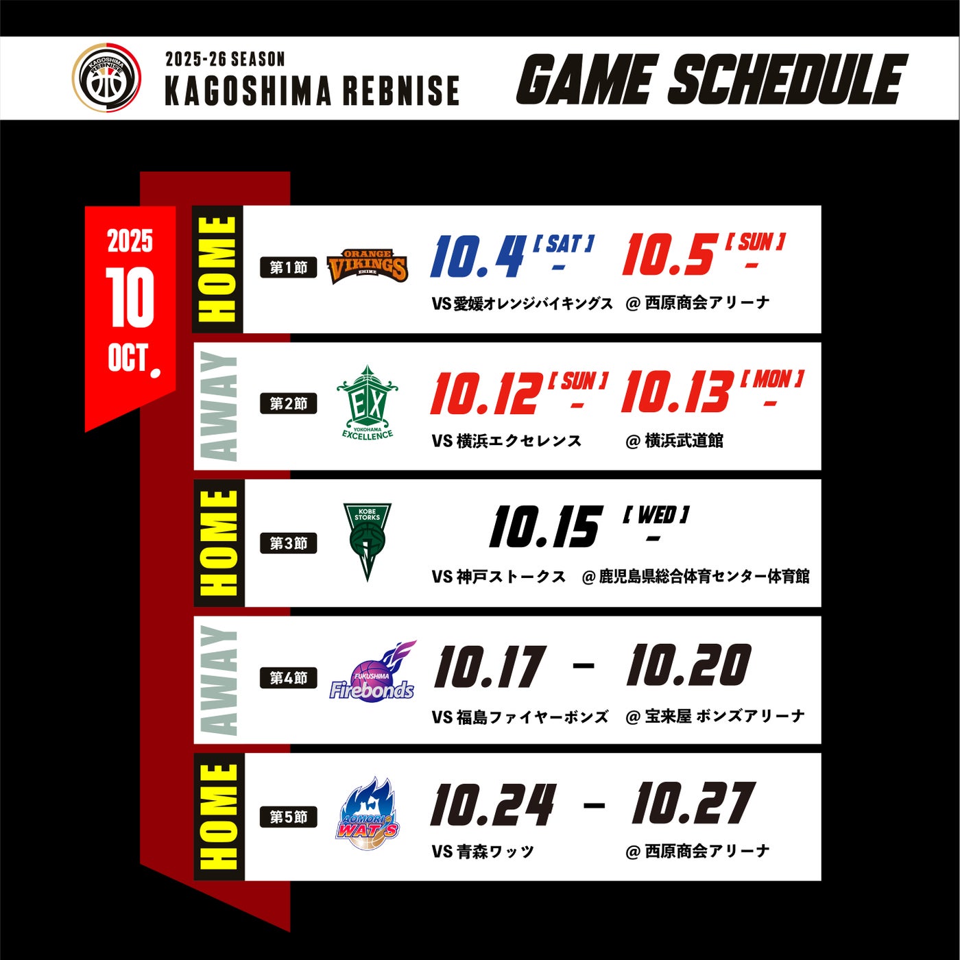 この度、鹿児島レブナイズでは、りそなグループ B.LEAGUE 2025-26シーズンの開幕カード及びリーグ戦前半戦のカーディング(対戦カード及び会場)が決定しましたのでお知らせいたします。