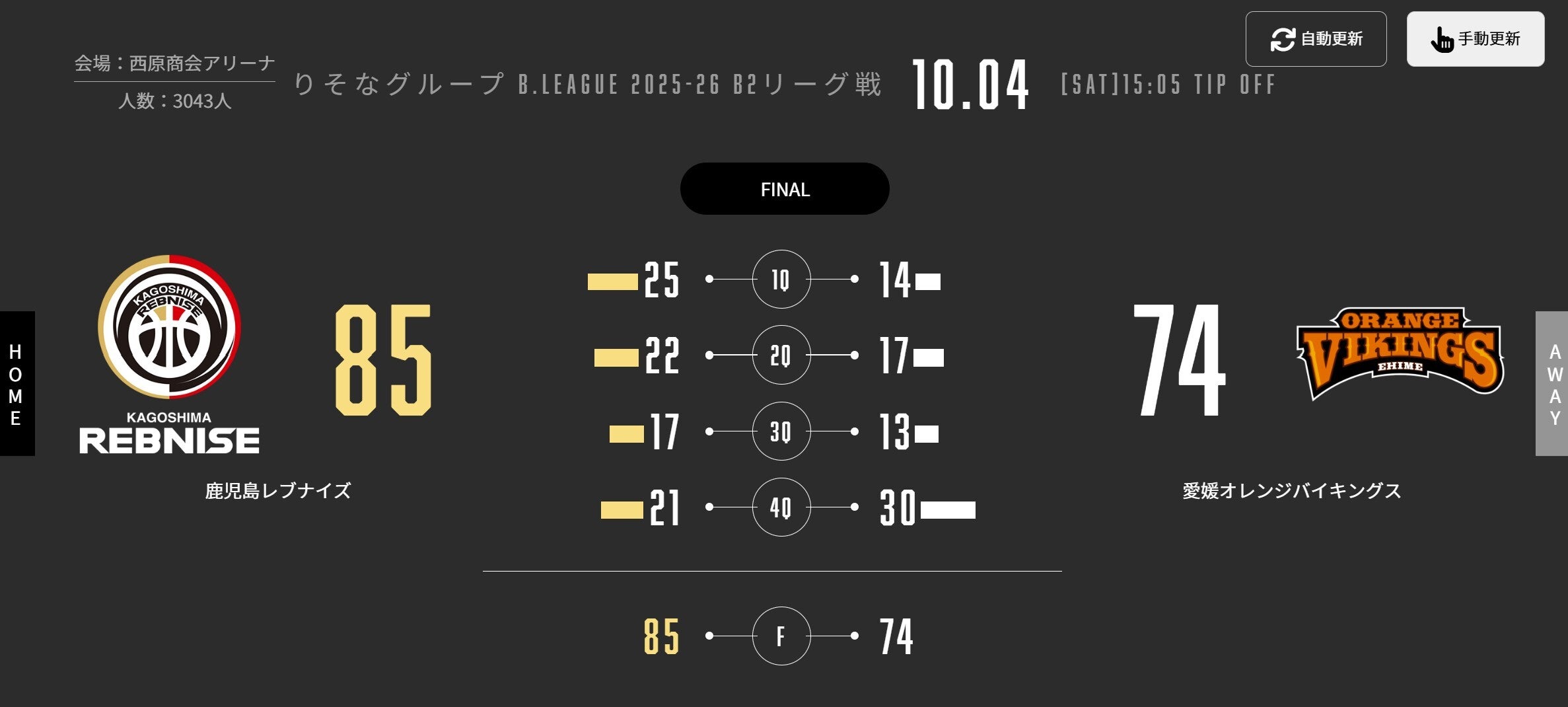 本日(10/4)、りそなグループ B.LEAGUE 2025-26シーズン 第1節 西原商会アリーナで愛媛オレンジバイキングスと対戦しました。試合結果をお知らせします。