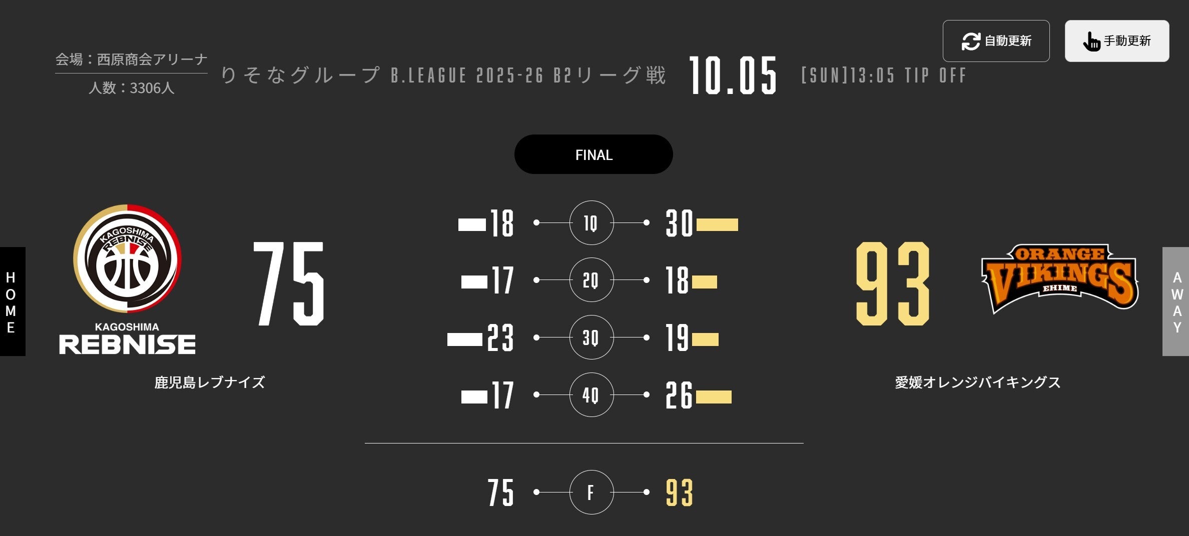本日(10/5)、りそなグループ B.LEAGUE 2025-26シーズン 第1節 西原商会アリーナで愛媛オレンジバイキングスと対戦しました。試合結果をお知らせします。