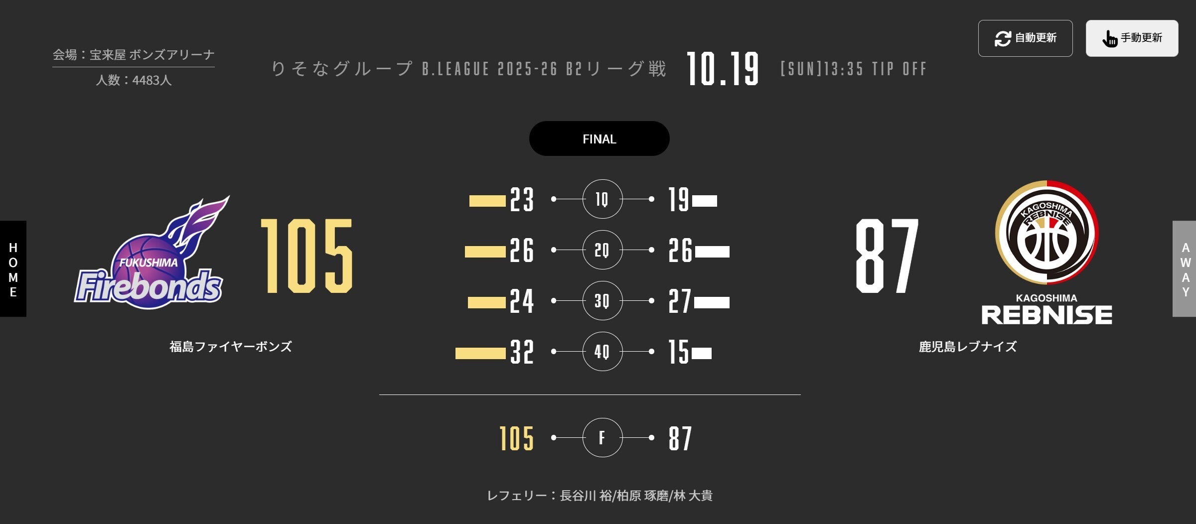 本日(10/19)、りそなグループ B.LEAGUE 2025-26シーズン 第4節 AWAY 宝来屋ボンズアリーナで福島ファイヤーボンズと対戦しました。試合結果をお知らせします。