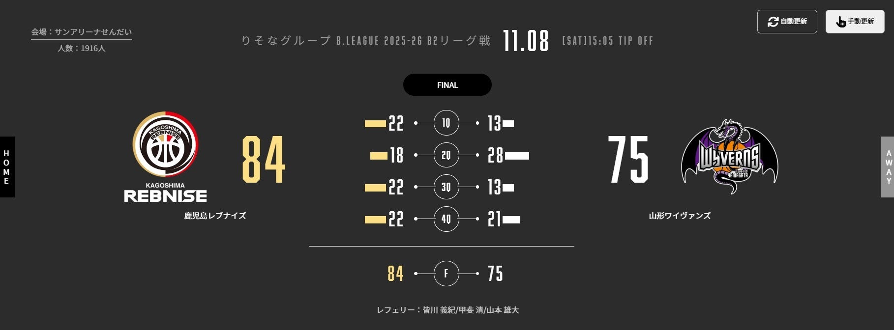 本日(11/8)、りそなグループ B.LEAGUE 2025-26シーズン 第7節 サンアリーナせんだいで山形ワイヴァンズと対戦しました。試合結果をお知らせします。