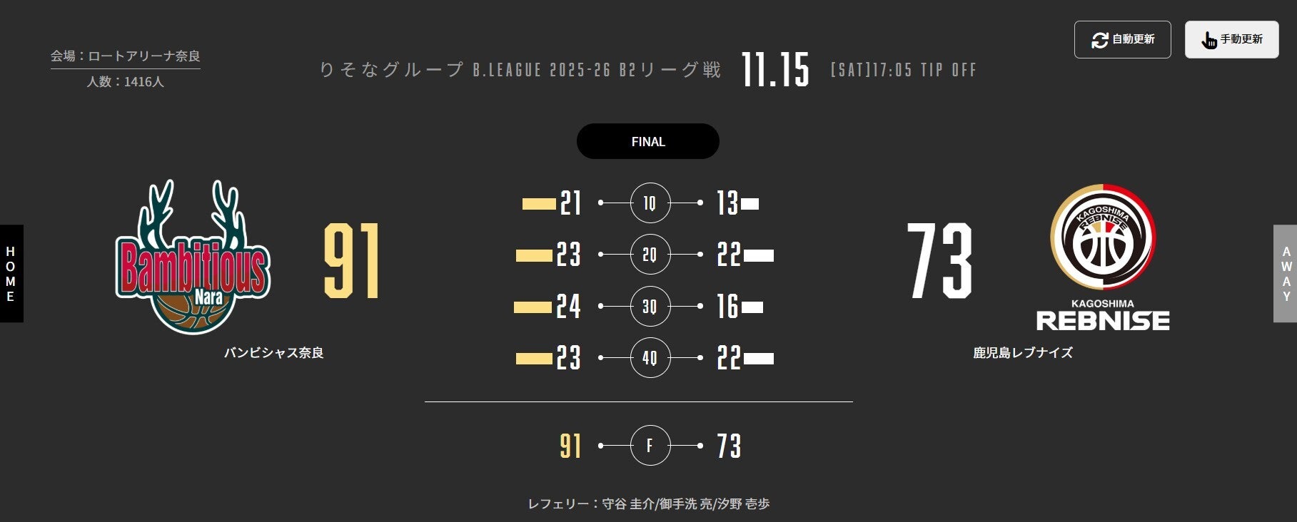 本日(11/15)、りそなグループ B.LEAGUE 2025-26シーズン 第8節 ロートアリーナ奈良でバンビシャス奈良と対戦しました。試合結果をお知らせします。