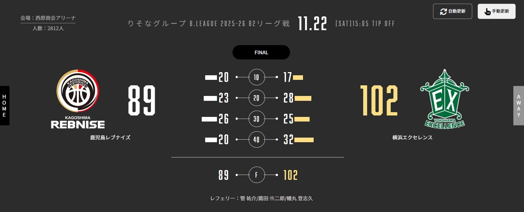 本日(11/22)、りそなグループ B.LEAGUE 2025-26シーズン 第9節 西原商会アリーナで横浜エクセレンスと対戦しました。試合結果をお知らせします。
