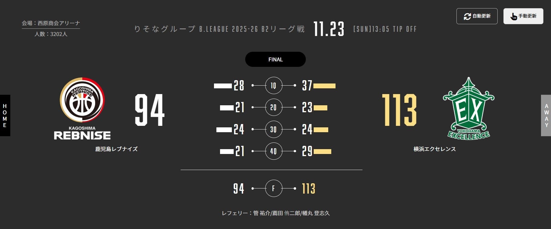 本日(11/23)、りそなグループ B.LEAGUE 2025-26シーズン 第9節 西原商会アリーナで横浜エクセレンスと対戦しました。試合結果をお知らせします。