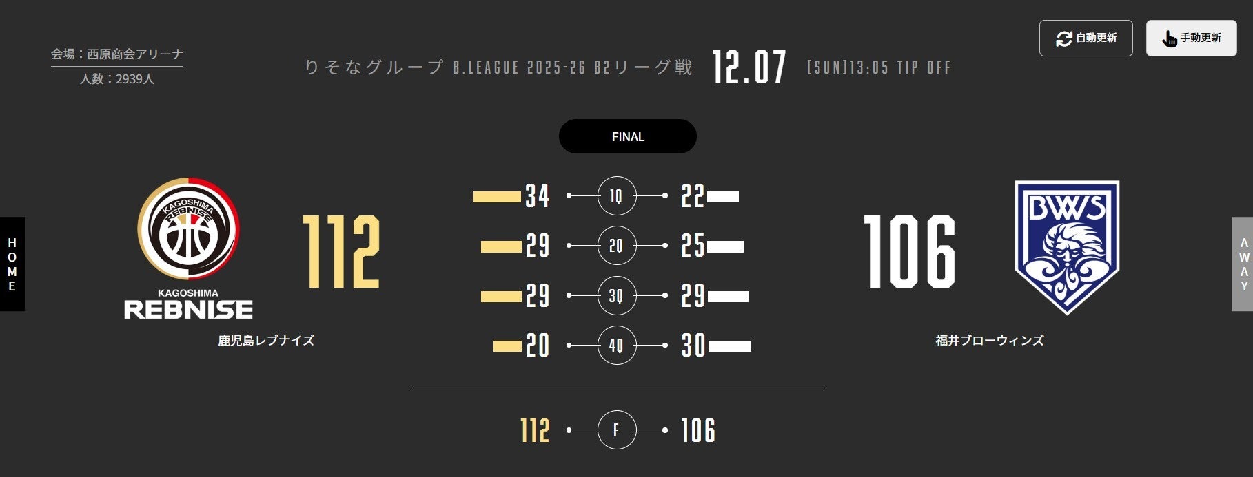 本日(12/7)、りそなグループ B.LEAGUE 2025-26シーズン 第11節 西原商会アリーナで福井ブローウィンズと対戦しました。試合結果をお知らせします。